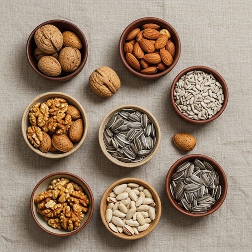 - 호두, 아몬드, 해바라기씨: 비타민 E와 마그네슘이 풍부해 신경세포 보호에 도움이 돼요.