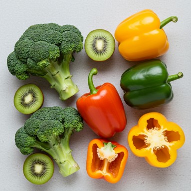 콜라겐 합성에 중요한 영양소로, 감귤류, 브로콜리, 키위, 파프리카 등에 많이 포함돼 있어요. - 비타민 A, E, 아연 등 항산화 영양소