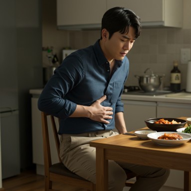 위산이 식도로 역류하면서 **가슴 중앙에서 타는 듯한 통증(속쓰림)**을 유발해요. 특히 식사 후 눕거나 기름진 음식을 먹은 후 증상이 나타나기 쉬워요. - 소화성 궤양, 위경련