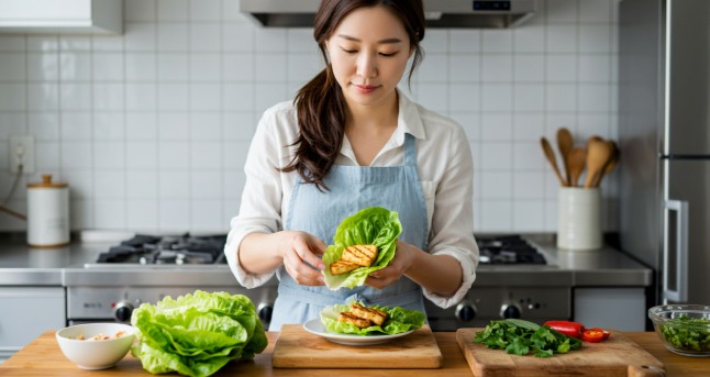 버터헤드 상추는 100g당 약 15kcal 정도로 열량이 낮고, 식이섬유가 적당히 포함되어 있어 소화 속도를 늦추고 포만감을 유지하는 데 도움이 돼요. 식사 전 샐러드나 쌈 형태로 섭취하면 과식 방지에 효과적이에요.