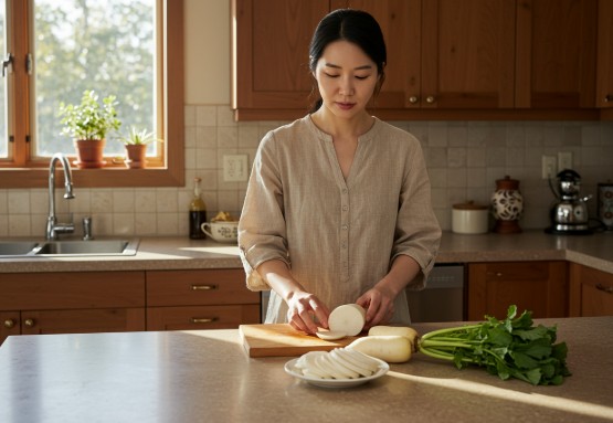 - 수분과 루테올린 성분이 풍부하여 기관지 점막을 진정시키고, 기침이나 가래 증상 완화에 효과적이에요.