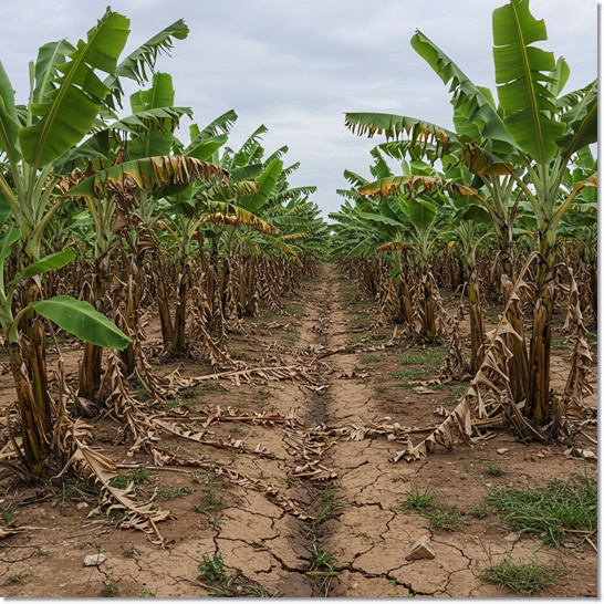 - 파나마병은 뿌리를 통해 식물을 감염시키는데, 바나나가 모두 같은 유전자를 가진 클론 식물이기 때문에 한 번 퍼지면 막을 수 없었어요. 토양에 한번 곰팡이가 퍼지면 수십 년간 그 땅에서는 바나나 재배가 불가능해요.