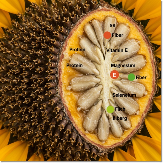 - 해바라기 씨에 풍부한 비타민 E는 피부의 산화 스트레스를 줄이고 노화를 예방해요.