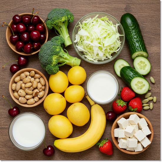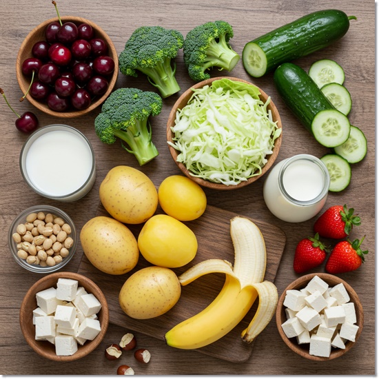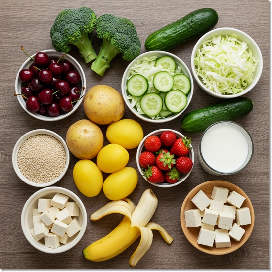 - 체리, 브로콜리, 양배추, 오이, 바나나, 감자, 저지방 우유, 두부, 딸기 등이 대표적이에요.