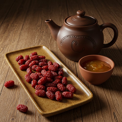 말린 산수유 약 10~15g을 흐르는 물에 씻은 후, 물 500ml에 넣고 약불에서 30분 이상 달여요. 진하게 우러나온 차는 꿀이나 대추를 함께 넣어 마시면 떫은맛이 부드러워지고, 기력 회복용 건강차로 적합해요.